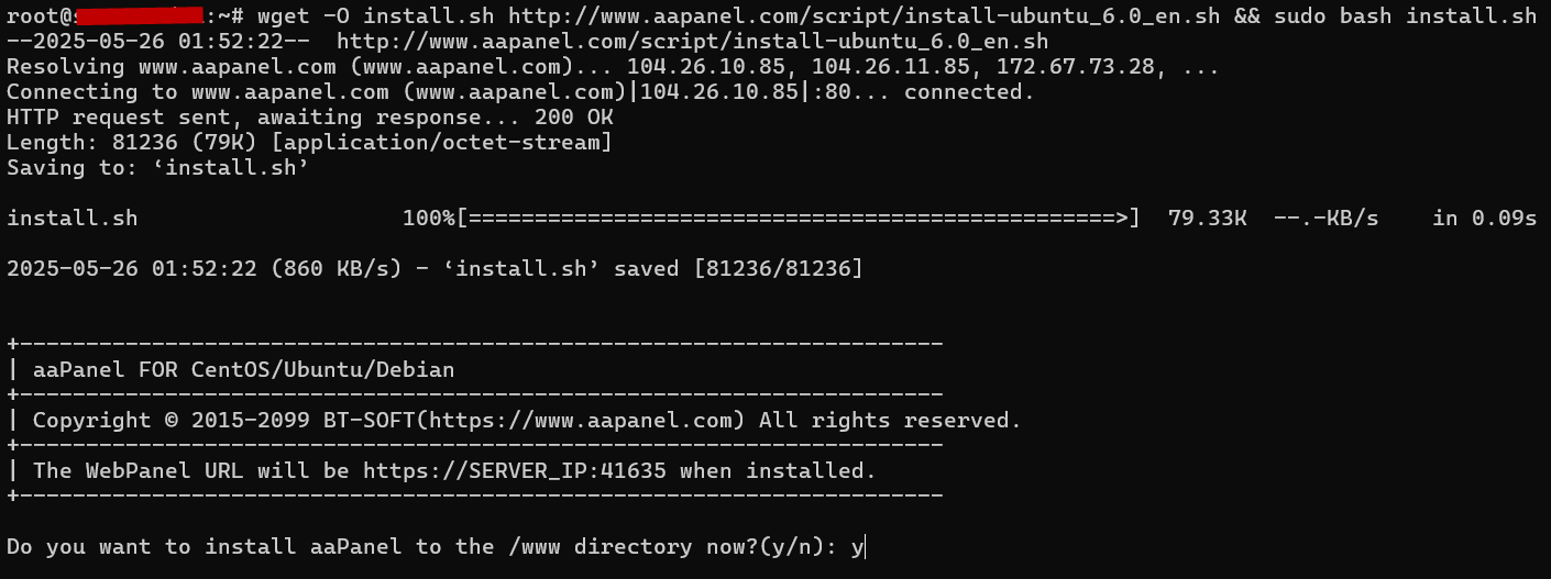 wget -O install.sh http://www.aapanel.com/script/install-ubuntu_6.0_en.sh && sudo bash install.sh - Konfirmasi Instalasi