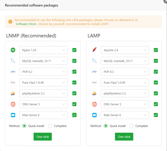 Setelah login pertama, aaPanel akan menawarkan pilihan instalasi stack (LNMP / LAMP). Anda bisa memilih sesuai dengan kebutuhan anda