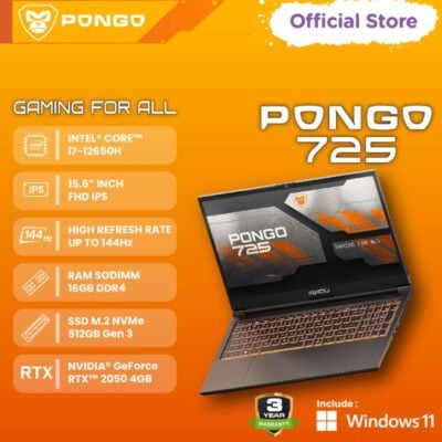 Axioo Pongo 725 merupakan laptop gaming lokal dengan harga terjangkau namun performa tinggi. Ditenagai oleh prosesor Intel Core i7 Gen 12 dan kartu grafis Nvidia GeForce RTX 2050 4GB, laptop ini cocok untuk kegiatan gaming, editing, dan desain grafis. Dilengkapi dengan layar FHD 15.6 inci dengan refresh rate 144Hz, serta backlit keyboard untuk kenyamanan dalam penggunaan.