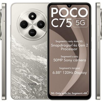 Untuk fotografi, Poco C75 5G dilengkapi kamera belakang tunggal 50 MP (f/1.8) dengan LED flash dan perekaman video 1080p. Kamera depan 5 MP (f/2.2) juga mendukung video 1080p untuk kebutuhan selfie. Daya tahan perangkat ini ditopang oleh baterai 5160 mAh dengan pengisian cepat 18W. Pilihan warna yang ditawarkan adalah Aqua Bliss, Enchanted Green, dan Silver Stardust, memberikan variasi yang menarik bagi pengguna.